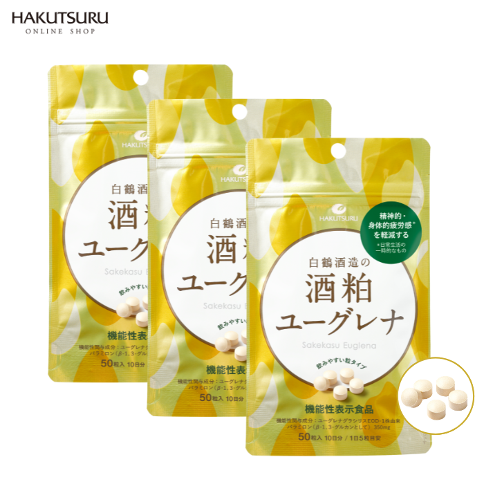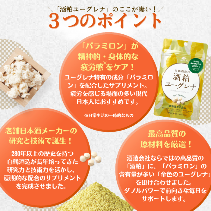 精神的・身体的な疲労感※1を軽減する機能が報告されている、食物繊維 β-グルカンの一種"パラミロン"を豊富に含む「ユーグレナ」と栄養の宝庫「酒粕」を配合した、毎日の栄養補給にぴったりのサプリメントです。